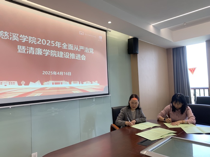为深入学习贯彻落实党的二十大和二十届三中全会精神,按照全省教育系统工作会议暨全面从严治党工作会议和学校全面从严治党工作暨清廉学校建设推进会会议要求,慈溪学院于4月16日下午,在慈溪校区综合楼B904召开学院2025年全面从严治党暨“清廉学校”建设推进会。学院领导班子成员、各专业主任、实训基地主任、全体支委、团总支书记、学生会秘书长出席本次会议。会议由党总支副书记陈建明主持。