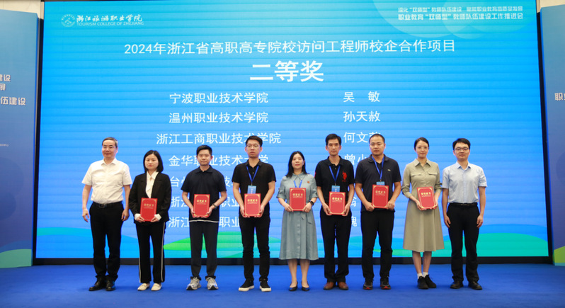 推进会首先进行了“2024年浙江省高职高专院校访问工程师校企合作成果评审”的现场汇报和答辩环节。最终评选出一等奖3名,二等奖7名,三等奖10名。经过激烈角逐,我校伟德国际应用电子技术专业何文荣老师最终获得二等奖,访工企业导师吴礼刚博士获得“最佳导师奖”荣誉称号。
