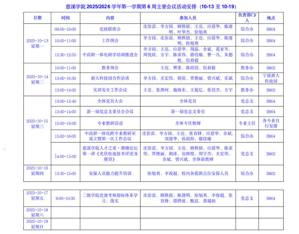 伟德国际2025/2026学年第一学期第6周主要活动安排