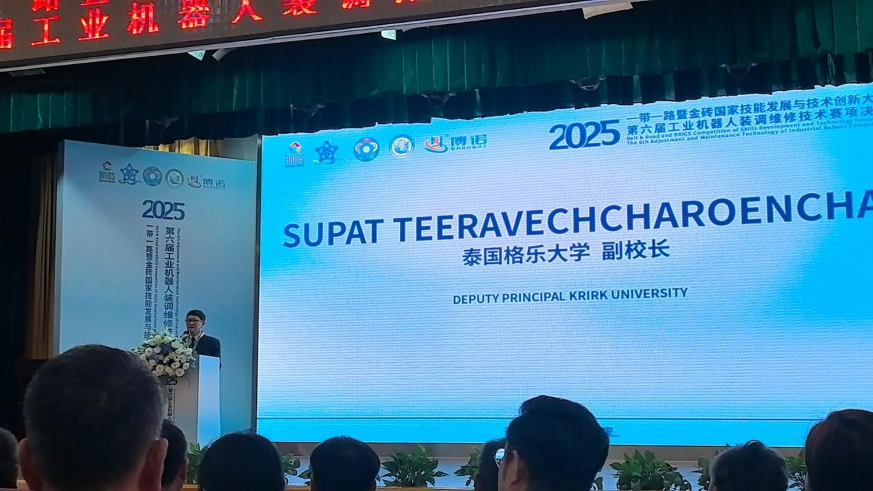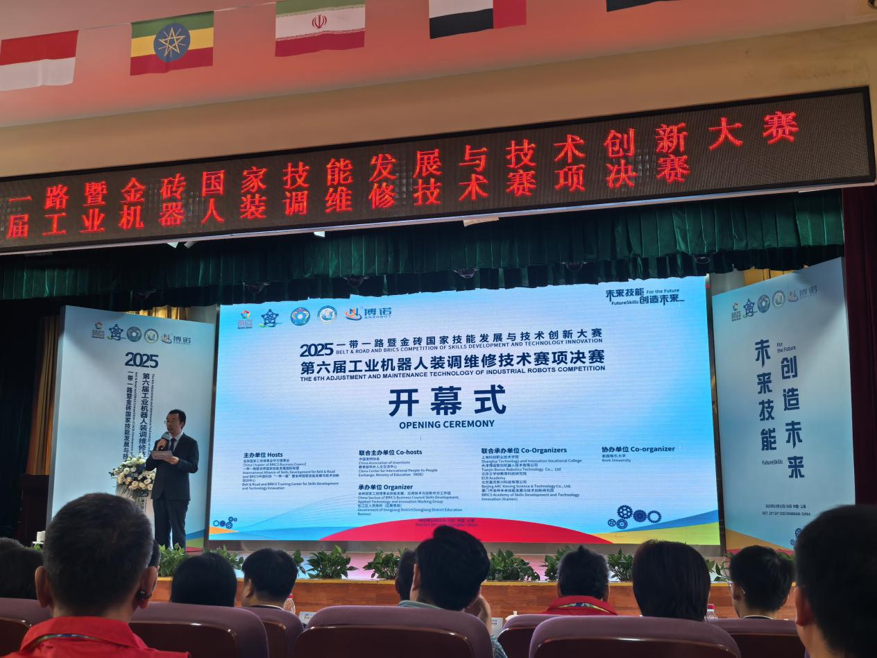 10 月 23 日,赛事开幕式在上海举行。来自金砖国家和 “一带一路” 沿线国家的政府代表、行业专家、院校领导及参赛选手齐聚一堂。泰国格乐大学副校长 Supat Teeravechcharoencha 等国际嘉宾在致辞中强调,技能大赛是推动各国职业教育交流、促进技术技能人才互鉴的重要纽带,期待通过赛事深化国际合作,为全球智能制造产业发展注入新动能。