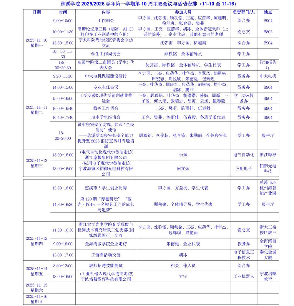 伟德国际20252026学年第一学期第10周主要会议与活动安排(11.10-11.16)