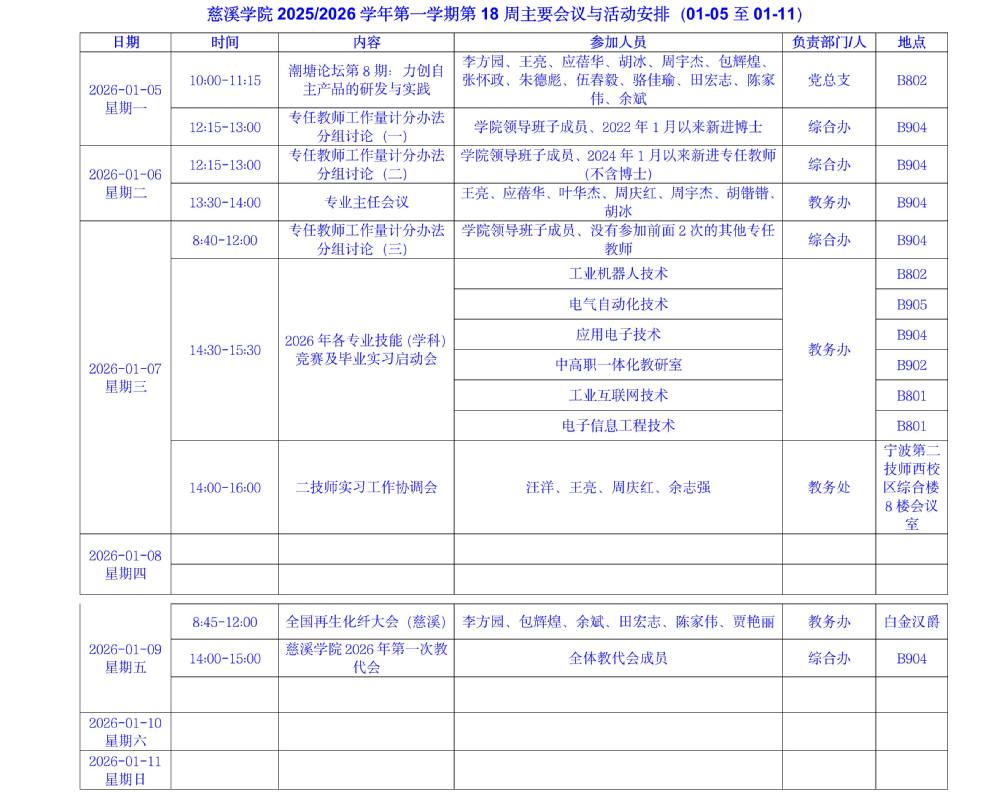 伟德国际2025-2026学年第一学期第18周主要会议与活动安排(1.5-1.11)