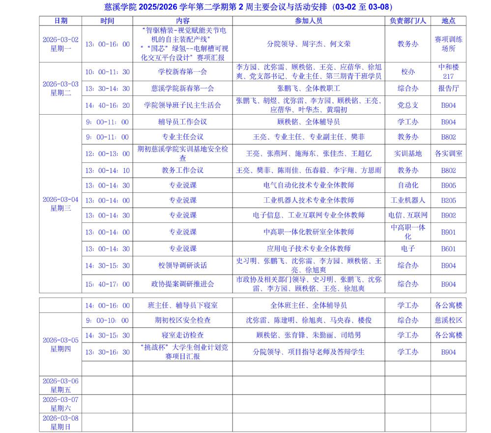 伟德国际2025/2026学年第二学期第2周主要会议与活动安排(03-02至03-08)