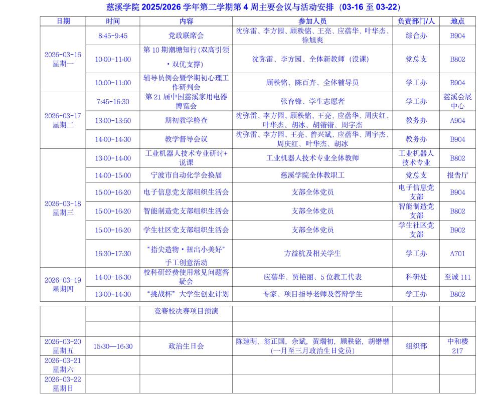 2025/2026学年第二学期第4周主要会议与活动安排(03-16至03-22)
