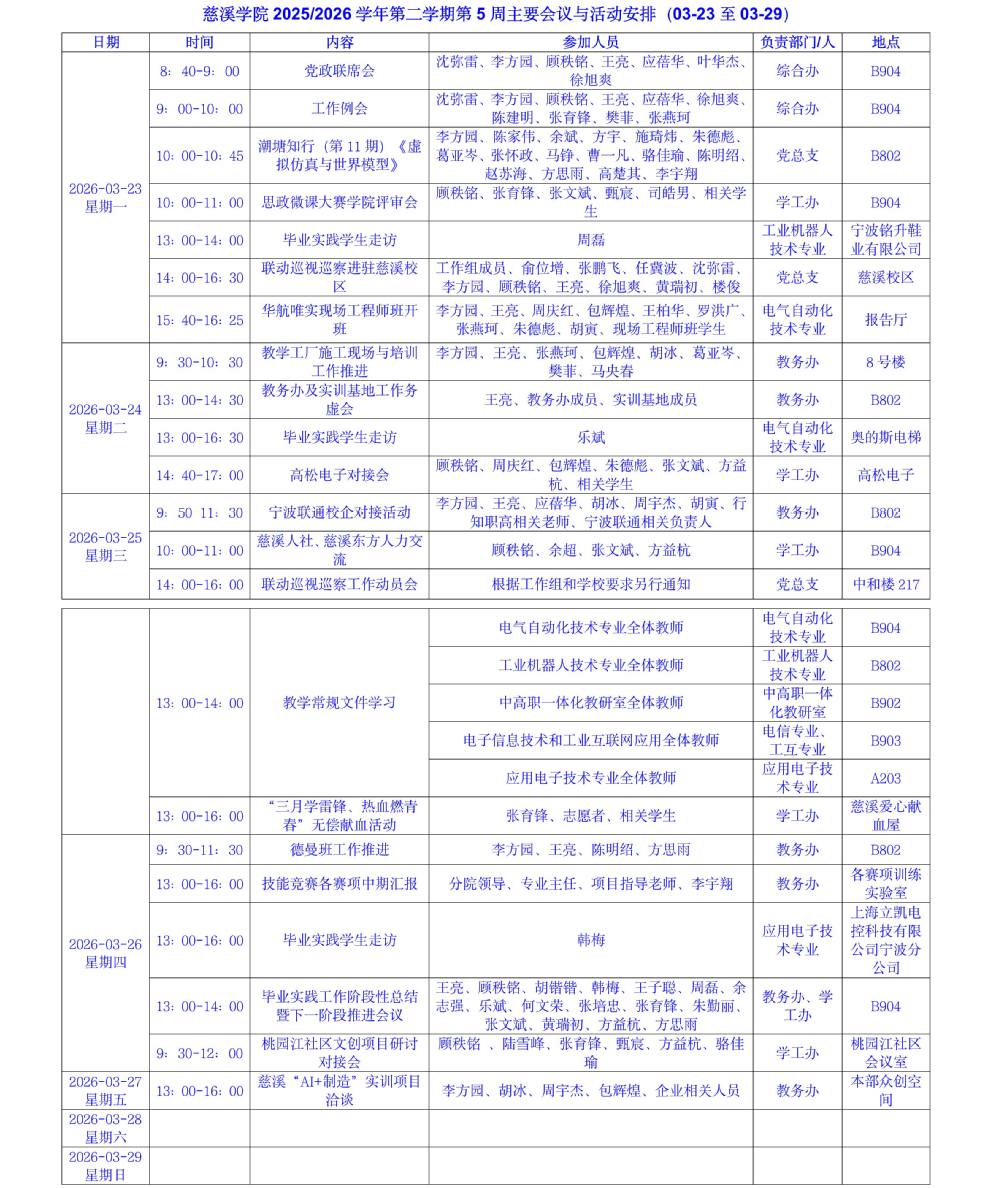 2025/2026学年第二学期第5周主要会议与活动安排(03-23至03-29)