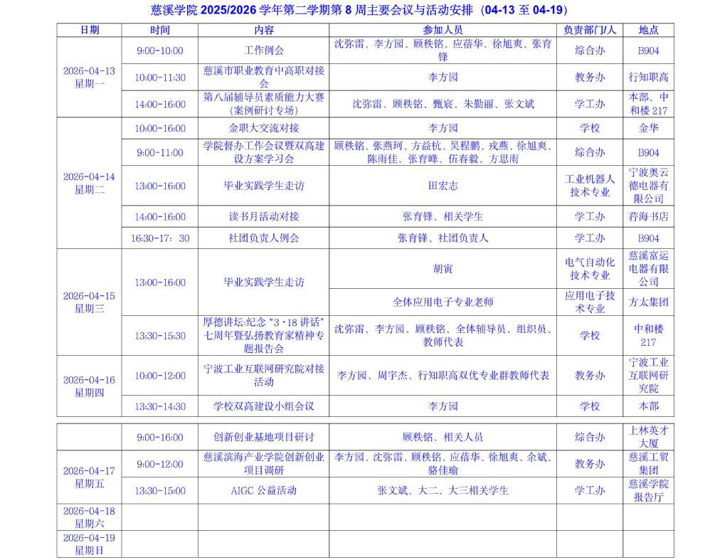 2025/2026学年第二学期第8周主要会议与活动安排